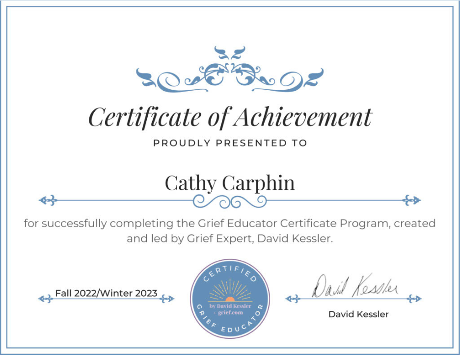 Cathy holds certificates in Life Coaching and Grief Education and has a Bachelor Degree in Psychology. She is a published author, poet and has posted her insights on the grieving process since 2023.